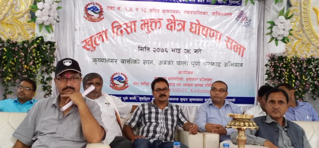जिल्लालाई खुला दिसामुक्त घोषणा गर्नु पूर्व दुई दिनमा दुई नगरपालिकालाई खुला दिसामुक्त घोषणा गरिएको छ । आइतबार कृष्णनगर नगरपालिका र सोमबार कपिलवस्तु नगरपालिका खुला दिसामुक्त घोषणा भएका छन् ।