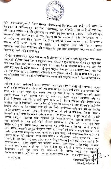 मिलले २७ गते विज्ञप्ती जारी गर्दै अनुदानको रकम नभएर भ्याटमा सरकरले सबै सुर्गस मिल्सलाई दिएको छुट अनुसार आफुले पाएको जनाएको छ । आर्थिक बर्ष २०७१÷०७२ मा मुल्य अभिवृद्धि करमा दर्ता भएका करदाताहरुलाई चिनी विक्रि गरी संकलन भएको मूल्य अभिवृद्धि करको ७० प्रतिशत र पुरै रकम र सो भन्दा पछिका बर्षहरुको हकमा संकलन भएको ९० प्रतिशत पुरै रकम कर विवरण मार्फत समायोजन भएको विज्ञप्तीमा जनाइएको छ । विज्ञप्तीमा श्री महालक्ष्मी सुर्गस मिल प्रा.लि.लाई जिम्मा लगाउने गरी गरिएको निर्णय प्राकृतिक न्यायको सिद्धान्त विपरित रहेकोले सर्वोच्च अदालतमा विचारधीन रहेको रीट निवेदन अन्तिम फैसला नहुन्जेल सम्मका लागी कुनै पनि निर्णय कार्यान्वयन नहुने भनि जानकारी गराईएको छ ।