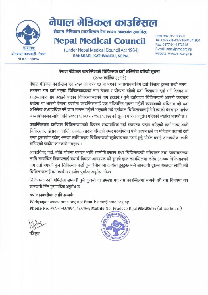 नेपाल मेडिकल काउन्सिलले चिकित्सकहरुको दर्ता अभिलेख अध्यावधिक गर्न र आफ्नो पछिल्लो विवरण काउन्सिललाई उपलब्ध गराउन सबै डाक्टरहरुलाई भनेको छ ।