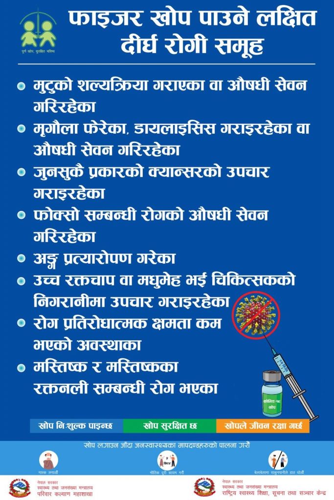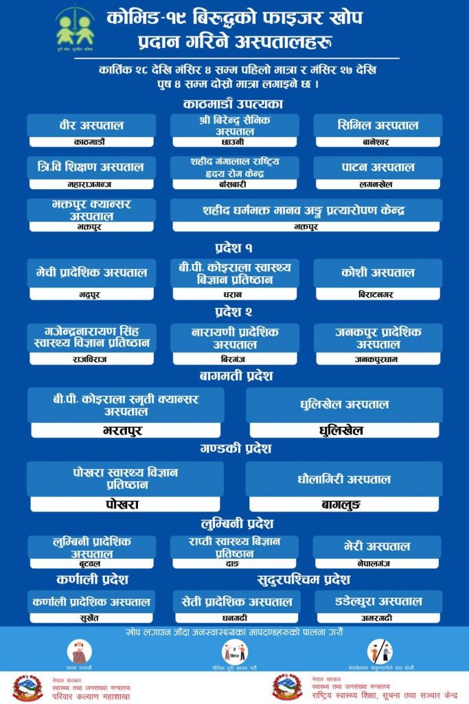 दीर्घ रोगीलाई दिइने फाइजर खोप काठमाण्डौ उपत्यकामा वीर अस्पताल, वीरेन्द्र सैनिक अस्पताल, सिभिल अस्पताल, त्रिवि शिक्षण अस्पताल, शहीद गङ्गालाल हृदय रोग केन्द्र, पाटन अस्पताल, भक्तपुर क्यान्सर अस्पताल र शहीद धर्मभक्त मानव अङ्ग प्रत्यारोपण केन्द्र भक्तपुरमा उपलब्ध हुनेछ ।