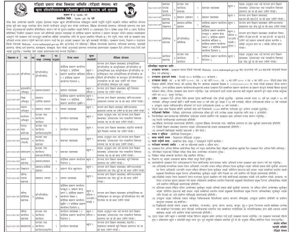 दरखास्त फाराम र पाठ्यक्रम रेडियो नेपालको वेबसाइटबाट डाउनलोड गर्न सकिनेछ भने कर्मचारी छनौट खुला प्रतियोगितात्मक परीक्षाद्वारा गरिनेछ । दरखास्त आह्वान भएकामा इन्जिनियर, प्रशासकीय अधिकृत, लेखा अधिकृत, कार्यक्रम अधिकृत, गायन–बाद्य संयोजक, सम्पादक (नेपाली), संवाददाता, प्रधान सहायक, लेखापाल, समाचार बाचक नेपाली, कार्यालय सहायक, लेखापाल, प्राविधिक सहायक, कार्यक्रम सहायक जस्ता पद रहेका छन् ।