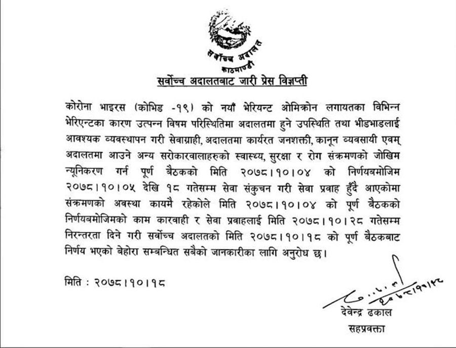 सर्वोच्चले मंगलबार विज्ञप्ति जारी गरी आगामी २८ गतेसम्म अहिलेकै स्वरुपमा सेवा प्रवाह हुने जनाएकाे छ। यसअघि सर्वोच्चकाे पूर्ण बैठकले ओमिक्रोनको संक्रमणको जोखिमलाई मध्यनजर राखेर माघ ५ गतेदेखि १८ गतेसम्म सेवा कटौती गर्ने निर्णय गरेको थियो।