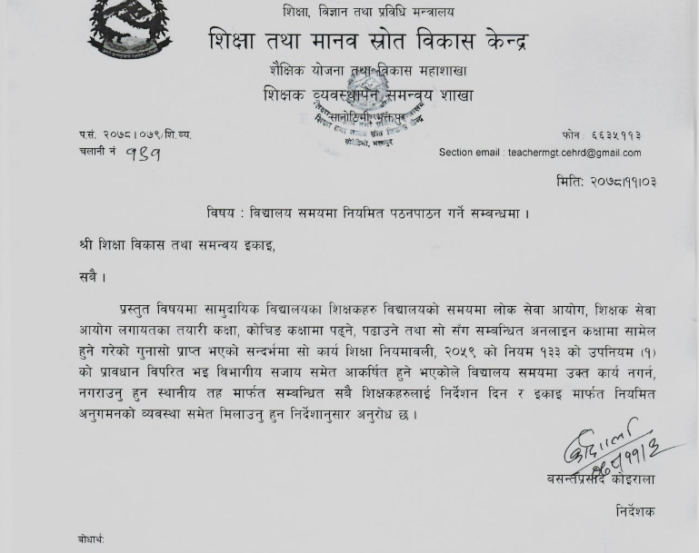 ‘यस्तो कार्य शिक्षा नियमावली २०५९ को नियम १३३ को उपनियम (१) को प्रावधान विपरीत भइ विभागीय सजायसमेत आकर्षित हुने भएकाले विद्यालय समयमा त्याे काम नगर्न, नगराउनु हुन स्थानीय तहमार्फत सम्बन्धित सबै शिक्षकहरूलाई निर्देशन दिन र इकाइमार्फत नियमित अनुगमनको व्यवस्थासमेत मिलाउन हुन अनुरोध छ’, शिक्षा तथा मानव स्रोत विकास केन्द्रको पत्रमा उल्लेख छ ।