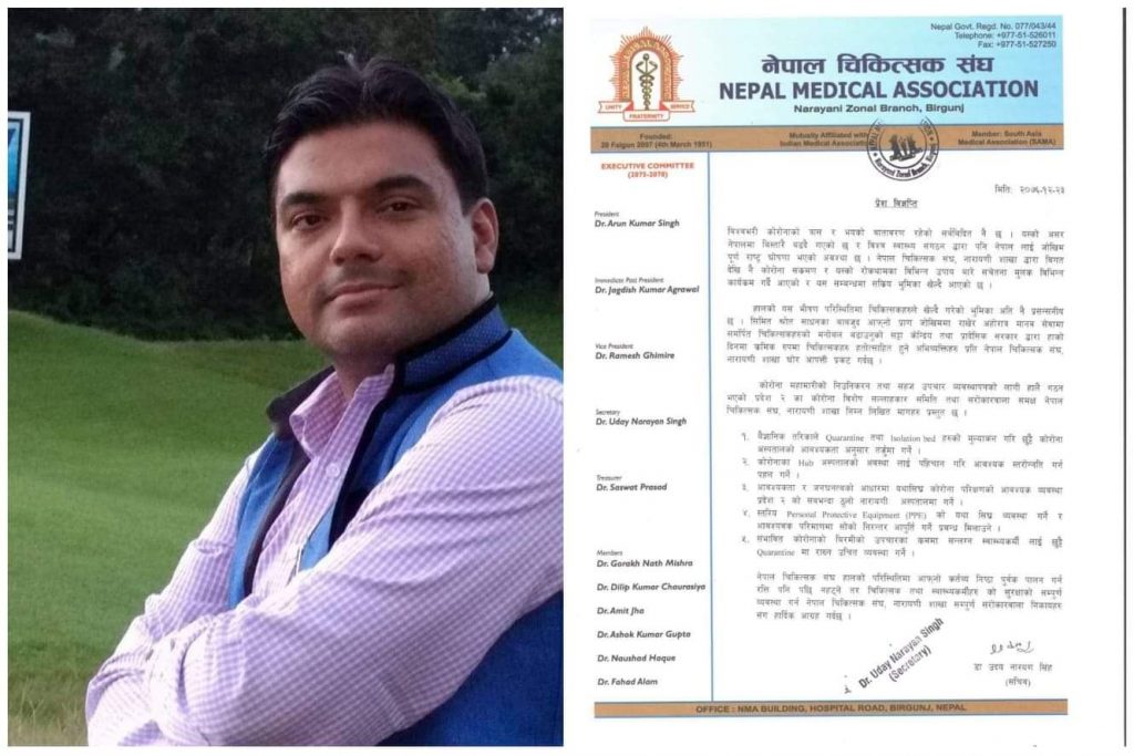 सोही क्रममा नेपाल चिकित्सक संघ नारायणी शाखा वीरगंजका सचिव डा. उदय नारायण सिंहले आज एक विज्ञप्ति जारी गर्दै कोरोना भाइरसको संक्रमणबाट बच्न र बचाउनको लागि प्रदेश नं. २ सरकार समक्ष विभिन्न मागहरु राखेका छन ।
