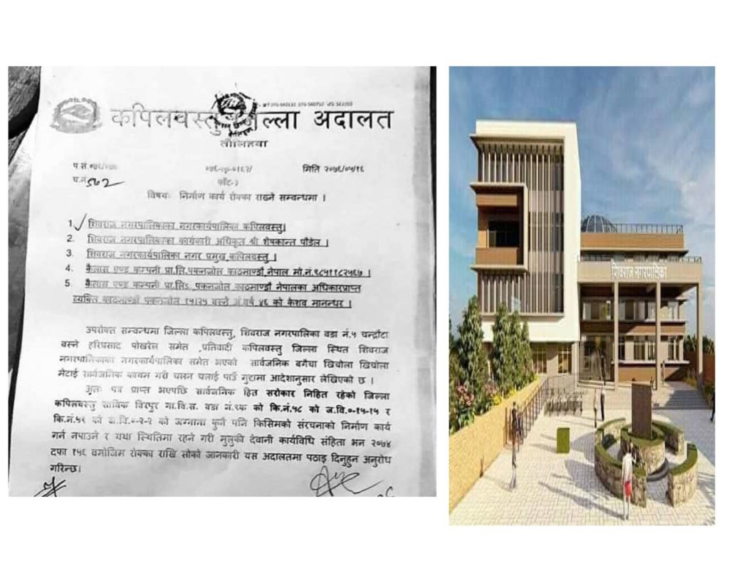 शिवराज नगरपालिकाको भवन निर्माण कार्य रोक्का गर्न जिल्ला अदालत कपिलवस्तुले आदेश दिएको छ । शिवराज नगरपालिकाको निमार्णधिन भवन गैरकानुनी रुपमा सार्वजनिक जग्गा अतिक्रमण गरी बनाउन लागेको भन्दै मुद्धा दयार गरीएको थियो ।