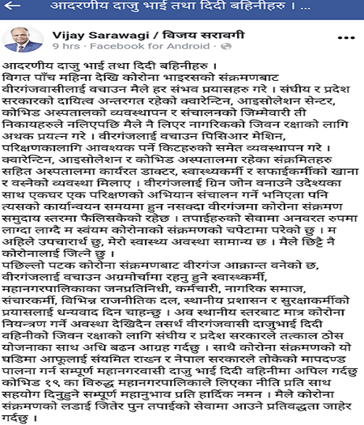 वीरगञ्ज महानगर प्रमुखलाई कोरोना सङ्क्रमण, छिट्टै निको भएर फर्कने विश्वास