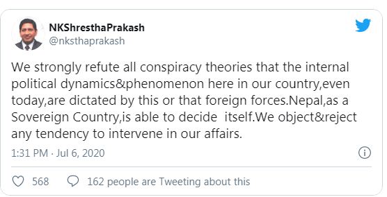 मुलुकको आन्तरिक राजनीतिमा विदेशी हस्तक्षेपबारे सत्तारुढ दलकै नेताहरुले समेत आपत्ति जनाएका छन् । नेकपाका प्रवक्ता नारायणकाजी श्रेष्ठले नेपालको आन्तरिक भूमिकामा विदेशीको हस्तक्षेप स्वीकार्य नरहेको भन्दै ट्विट गर्नभएको छ ।