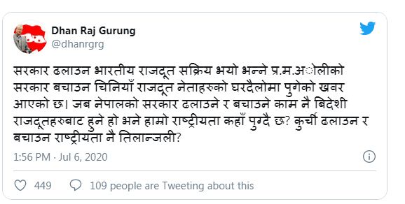 यस्तै प्रमुख विपक्षी नेपाली कांग्रेसका नेता धनराज गुरुङले पनि माधव नेपालसँग चिनियाँ राजदूत यान्छीको भेटघाटबारे टिप्पणी गर्दै कुर्सी ढलाउन र बचाउन राष्ट्रियतालाई नै तिलाञ्जली भनेर प्रश्न गर्नुभएको छ ।