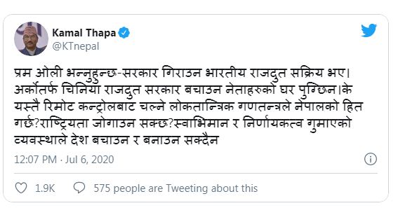 कतिपयले भारतीय हस्तक्षेपको विरोध गरेर प्रधानमन्त्री ओलीले चिनियाँ हस्तक्षेपलाई स्वागत गरेको कठोर टिप्पणी समेत गरेका छन् । पूर्व परराष्ट्रमन्त्री समेत रहनुभएका राष्ट्रिय प्रजातन्त्र पार्टीका अध्यक्ष कमल थापाले राजदूत यान्छीको सक्रियतालाई ‘रिमोट कन्ट्रोल’को संज्ञा दिनुभएको छ । एकातिर प्रधानमन्त्रीले सरकार ढाल्न भारतीय राजदूत सक्रिय भएको अभिव्यक्ति दिने तर अर्कोतर्फ चिनियाँ राजदूत सरकार बचाउन नेताहरूको घरमा पुगेको भन्दै थापाले के यस्तै रिमोट कन्ट्रोलबाट चल्ने लोकतान्त्रिक गणतन्त्रले नेपालको हित गर्छ ? राष्ट्रियता जोगाउन सक्छ ? भनेर सामाजिक सञ्जालमार्फत प्रश्न गर्नुभएको छ ।