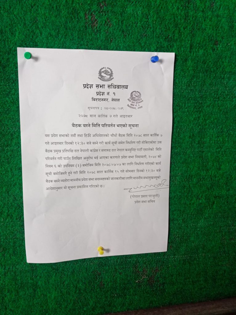 ‘२०४७ को नियम ६ को उपनियम (३) बमोजिम मिति २०७८/०७/०७ का लागि निर्धारण गरिएको कार्यसूची बमोजिम नै हुने गरी ०७८ कात्तिक १५ गते सोमबार दिनको १२ः३० बजे बैठक बस्ने’, जारी सूचनामा उल्लेख छ।