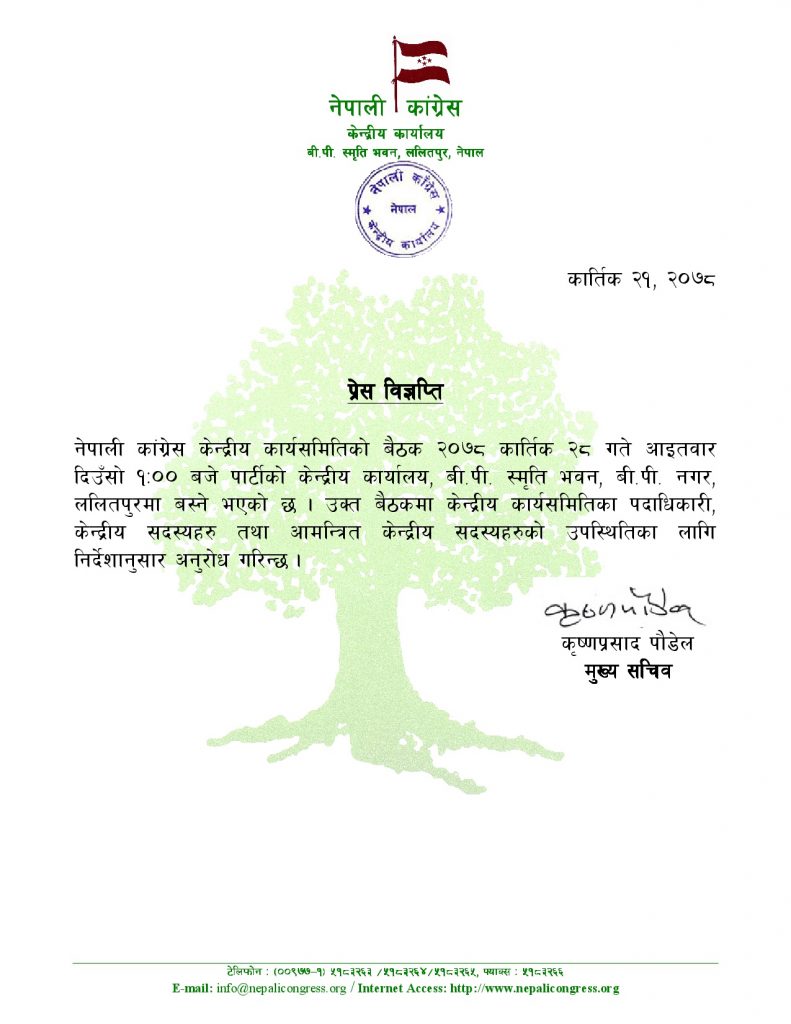 कार्यसमितिकाे बैठक ललितपुरको सानेपामा रहेकाे कांग्रेस केन्द्रीय कार्यालय वीपी स्मृति भवनमा दिउँसो १ बजे बस्ने केन्द्रीय कार्यालय सचिव कृष्णप्रसाद पौडेलले निकाल्नुभएकाे विज्ञप्तिमा उल्लेख छ ।