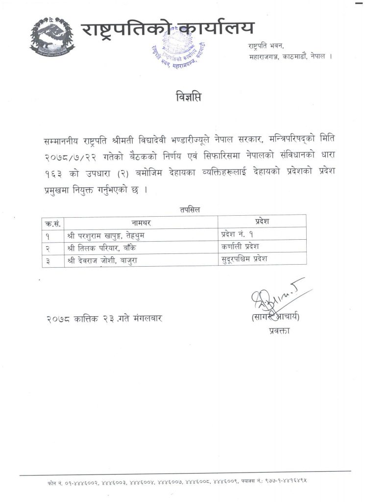 राष्ट्रपति भण्डारीले प्रदेश १ मा पर्शुराम खापुङ, कर्णालीमा तिलक परियार र सुदूरपश्चिममा देवराज जोशीलाई प्रदेश प्रमुखमा नियुक्त गरेको राष्ट्रपति कार्यालयले विज्ञप्तिमार्फत जनाएको छ।