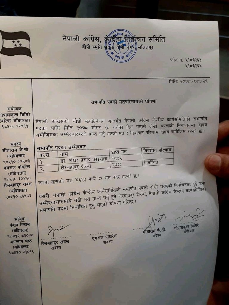 पहिलो चरणमा सोमबार भएको मतदानमा सभापतिका पाँच उम्मेदवारमध्ये कसैको पक्षमा पनि बहुमत नआएपछि शीर्ष मत ल्याउने दुई उम्मेदवार देउवा र कोइरालाले दोस्रो चरणमा प्रतिस्पर्धा गरेका थिए।