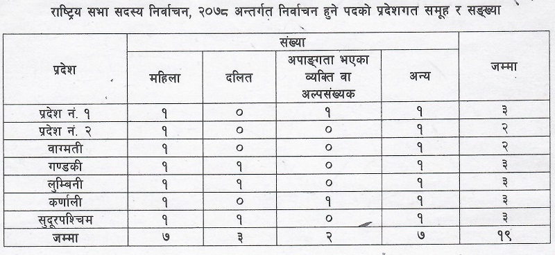 राष्ट्रिय सभाका सदस्यमध्ये फागुन २० गते पदावधि समाप्त हुनेमा नेकपा (एमाले)का आठ, नेकपा (एकीकृत समाजवादी)का चार, नेकपा (माओवादी केन्द्र)का चार र नेपाली कांग्रेसका तीन सदस्य छन् । यही पुस १७ गते मतदाता नामावली प्रकाशित गर्ने कार्यतालिका रहेको छ ।