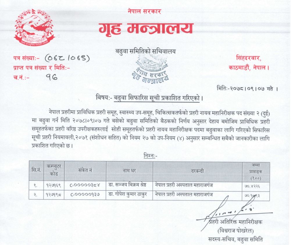 गृह मन्त्रालयको बढुवा सिफारिस समितिको बुधबार बसेको बैठकले नेपाल प्रहरीमा प्राविधिक समूह, स्वास्थ्य उपसमूहका एसएसपी डा सञ्जयविक्रम श्रेष्ठ र डा गोपेशकुमार ठाकुरलाई डिआइजीपी पदमा बढुवाका लागि सिफारिस गर्ने निर्णय गरेको हो।