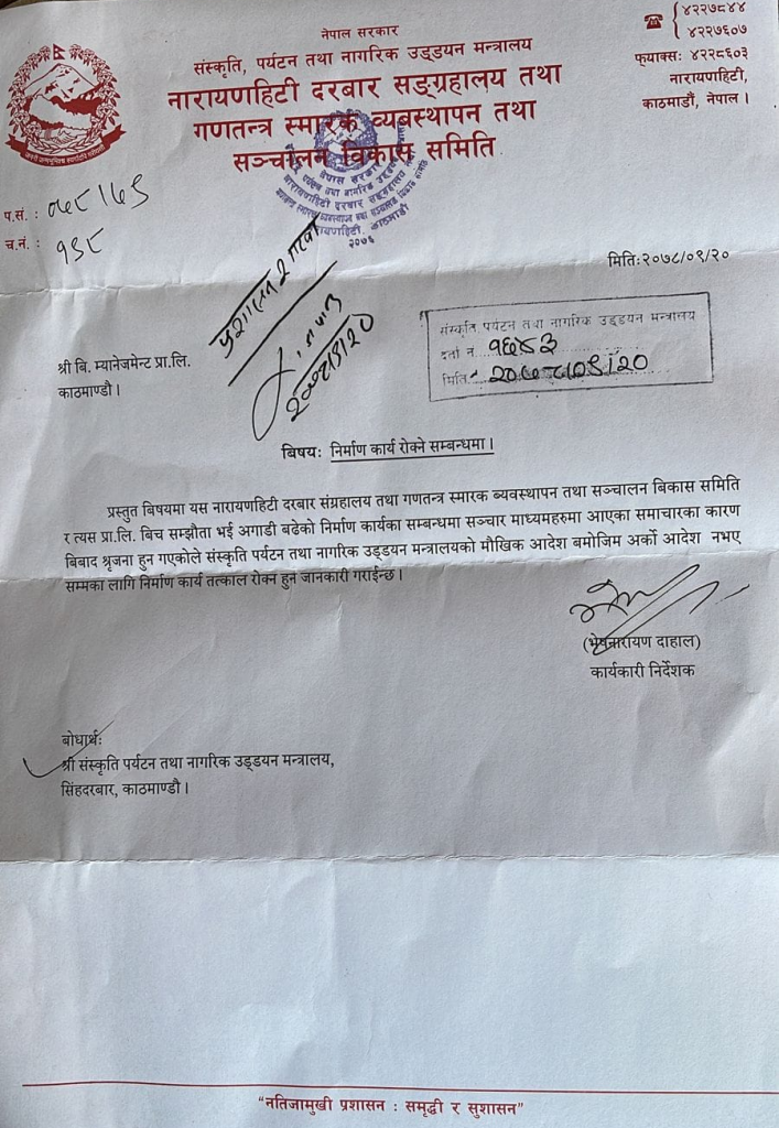 मन्त्रीको निर्देशनपछि समितिले बि म्यानेजमेन्ट प्रालिलाई पत्र लेखेर अर्को आदेश नभएसम्मका लागि काम रोक्न निर्देशन दिएको हो । पुरातात्त्विक क्षेत्र मानिएको नारायणहिटी दरबार सङ्ग्रहालयभित्र रेस्टुरेन्ट बन्दै गरेको समाचार बाहिरिएपछि चौतर्फी आलोचना भएको थियो ।