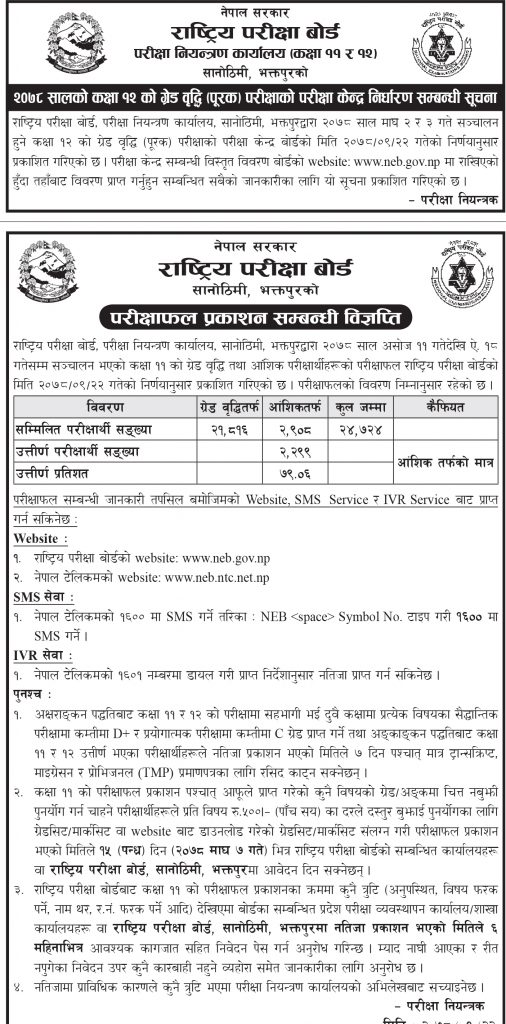 बोर्डका अनुसार ७९ दशमलव ०६ प्रतिशत विद्यार्थी उत्तीर्ण भएका छन्। यस्तै कक्षा १२ को ग्रेड वृद्धि माघ २ र ३ गते गर्ने भएको छ।