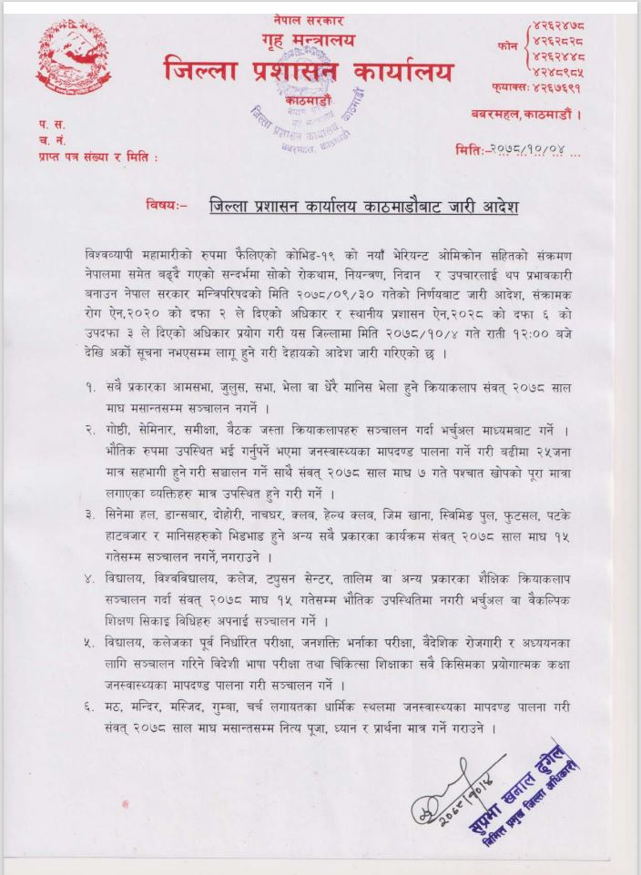 त्यसैगरी होटल तथा रेस्टुराँमा प्रवेश गर्ने सबै सेवाग्राहीले मास्क अनिवार्य गर्नुपर्ने तथा होटल तथा रेस्टुराँले कुल क्षमताको आधाभन्दा बढी नहुने गरी कम्तीमा दुई मिटरको भौतिक दूरी कायम गर्नुपर्नेछ।