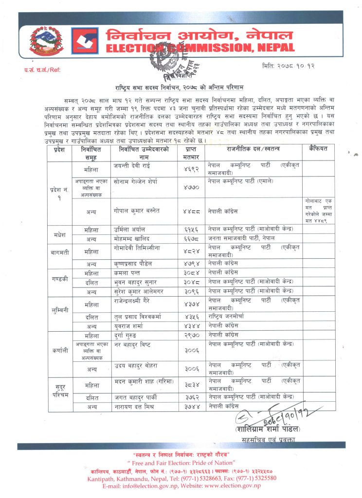 काठमाडौं : राष्ट्रियसभा सदस्य १९ रिक्त पदका लागि बुधबार भएको निर्वाचनमा पाँच दलीय गठबन्धनका उम्मेदवार १८ पदमा विजयी भए।