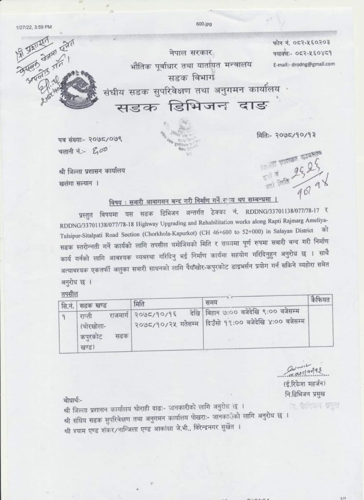 पर्सि माघ १६ देखि २५ गतेसम्म बिहान ७ देखि ९ बजेसम्म र बिहान ११ बजेदेखि दिउँसो ४ बजेसम्म १० दिन आवागमन बन्द गरिने उहाँले जानकारी दिनुभयो । यस सडक स्तरोन्नतिकोे जिम्मा नान्जिला एण्ड आकांक्षा जेभीले लिएको छ ।