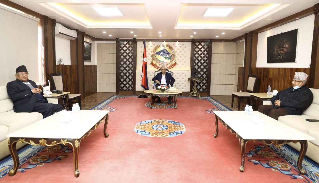 प्रधानमन्त्री निवास बालुवाटारमा प्रधानमन्त्री शेरबहादुर देउवा, नेकपा माओवादी केन्द्रका अध्यक्ष पुष्पकमल दाहाल प्रचण्ड र नेकपा एकीकृत समाजवादीका अध्यक्ष माधवकुमार नेपालबीच भएको भेटवार्तामा एमसीसी संसदमा पेस गर्नेबारेमा छलफल भए पनि सहमति नजुटेको प्रधानमन्त्रीको सचिवालयले जनाएको छ । भेटमा एमसीसी सम्झौता संसदमा अघि बढाउने विभिन्न विकल्पहरूबारे छलफल भएको र प्रधानमन्त्री देउवाले प्रतिनिधिसभाको अब बस्ने बैठकमा सम्झौता पेस गर्ने प्रस्ताव गरेकोमा दाहाल र नेपालले अहिलेकै अवस्थामा एमसीसी अघि बढाउन नसकिने बताउनुभएको सचिवालयले जनाएको छ ।