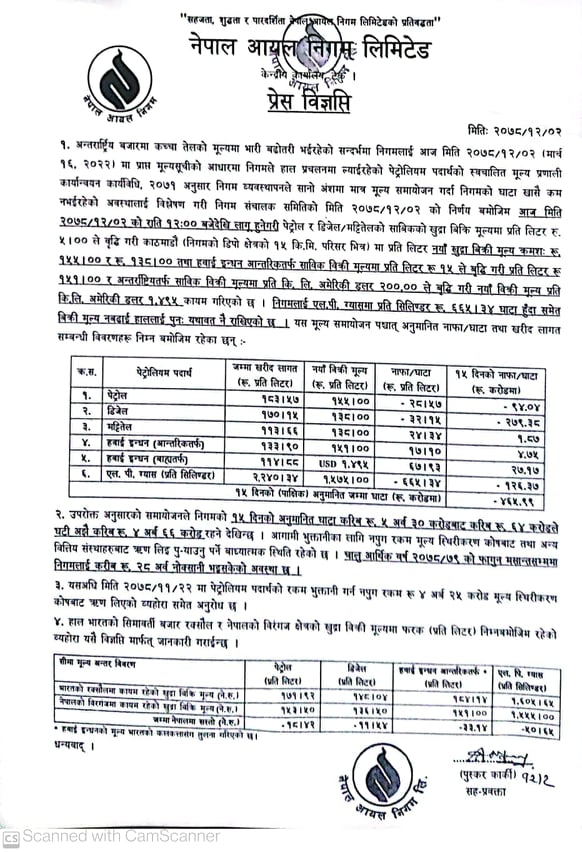 नेपाल आयल निगमले फेरि बढायो पेट्रोलियम पदार्थको भाउ