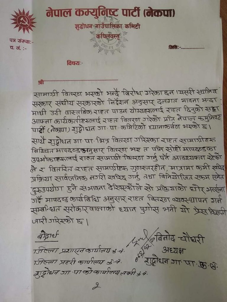 स्थानीय सरकार संघीय सरकारको निर्देशन अुनसार दलगत भावना भन्दा माथि उठी वास्तविक राहात पाउन योग्हरुलाई राहत दिनु सट्टा आफ्ना कार्यकर्ताहरुलाई राहात वितरणको गरेको प्रति नेपाल कम्युनिष्ट पार्टी शुद्धोधन गाउँ कमिटिको गम्भिर ध्यानाकर्षण विज्ञाप्तीमा उल्लेख छ ।