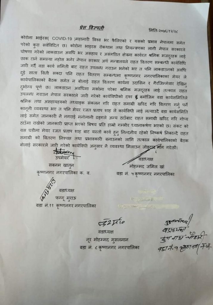 कृष्णनगर नगरपालिकाको उपमेयर तथा वार्ड अध्यक्षहरुले आज प्रेस बिज्ञप्ति निकाल्दै यस बिपदको बेला नगरपालिकाले वडा कार्य समिती लाई समेत जानकारी नै न गराई मनमानी तरीकाबाट राहत खरीद गरेको कार्य प्रति गम्भीर ध्यानाकर्षण भएको कुरा उल्लेख गरेका छन् ।
