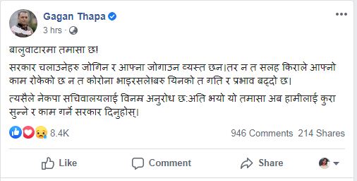काठमाण्डाै – सत्तारुढ नेपाल कम्युनिष्ट पार्टी नेकपाभित्रको विवादलाई लिएर नेपाली कांग्रेसका युवा नेता गगन थापाले बालुवाटारमा तमासा भएको टिप्पणी गर्नुभएको छ । उहाँले सामाजिक सञ्जाल फेसबुकमा लेख्नुभएको छ;