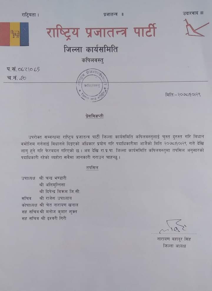 राप्रपा कपिलवस्तुको पदाधिकारी फेरबदल (हेर्नुस् नामवली )