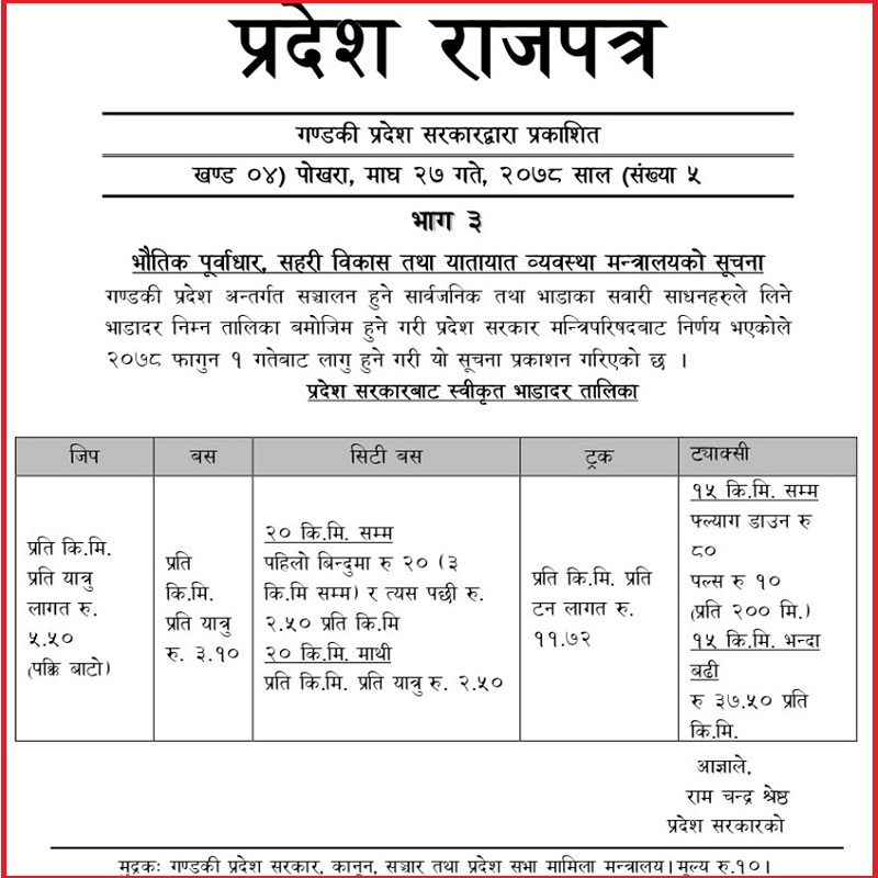 गण्डकी प्रदेशमा गाडी भाडा बढ्यो