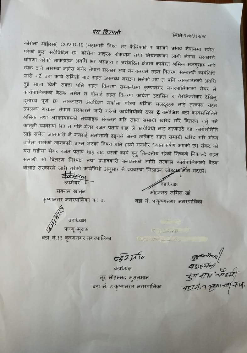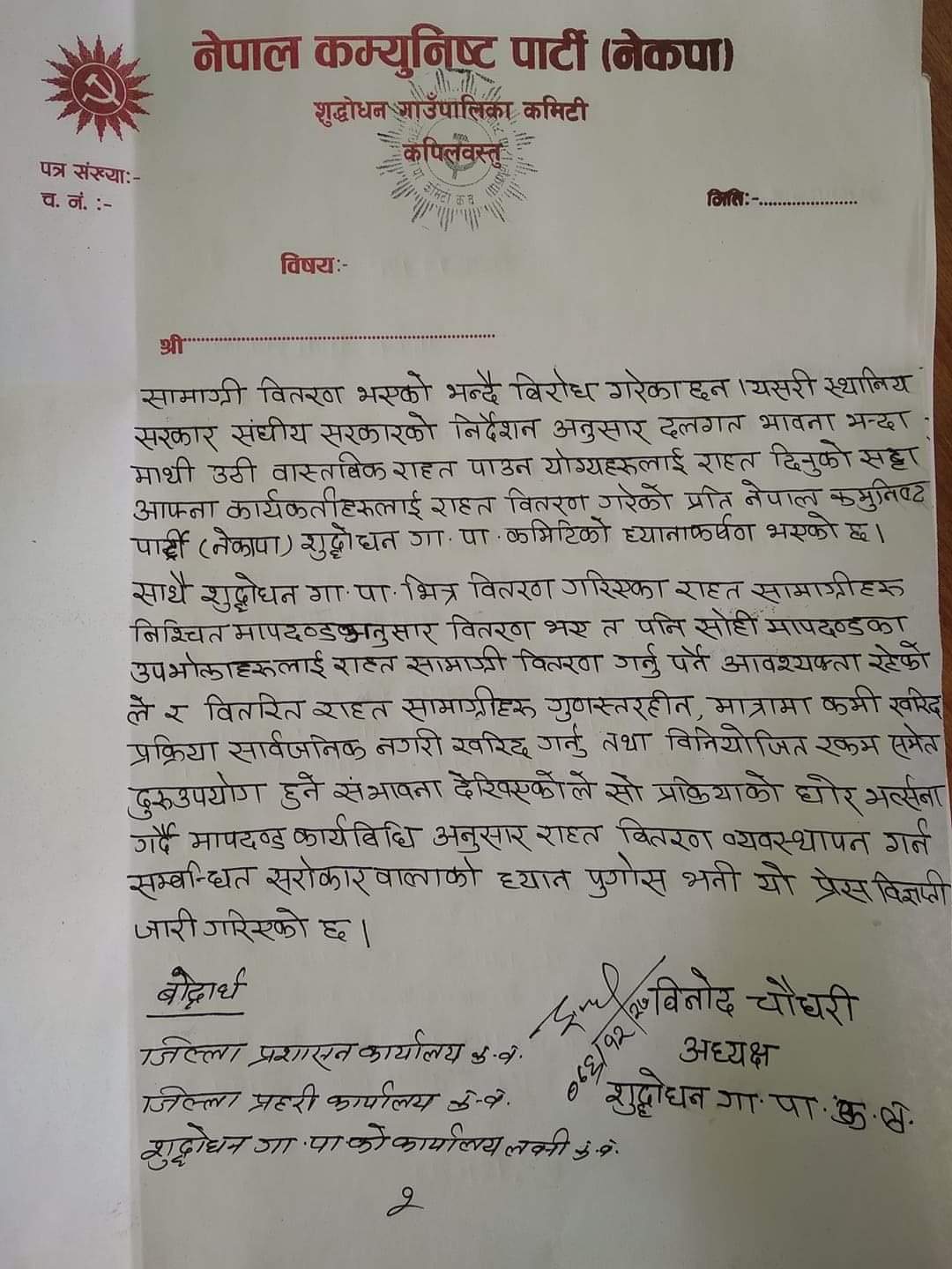 राहत वितरणमा मापदण्ड अनुसार राहत दिनु पर्ने नेकपा शुद्धोधनको माग